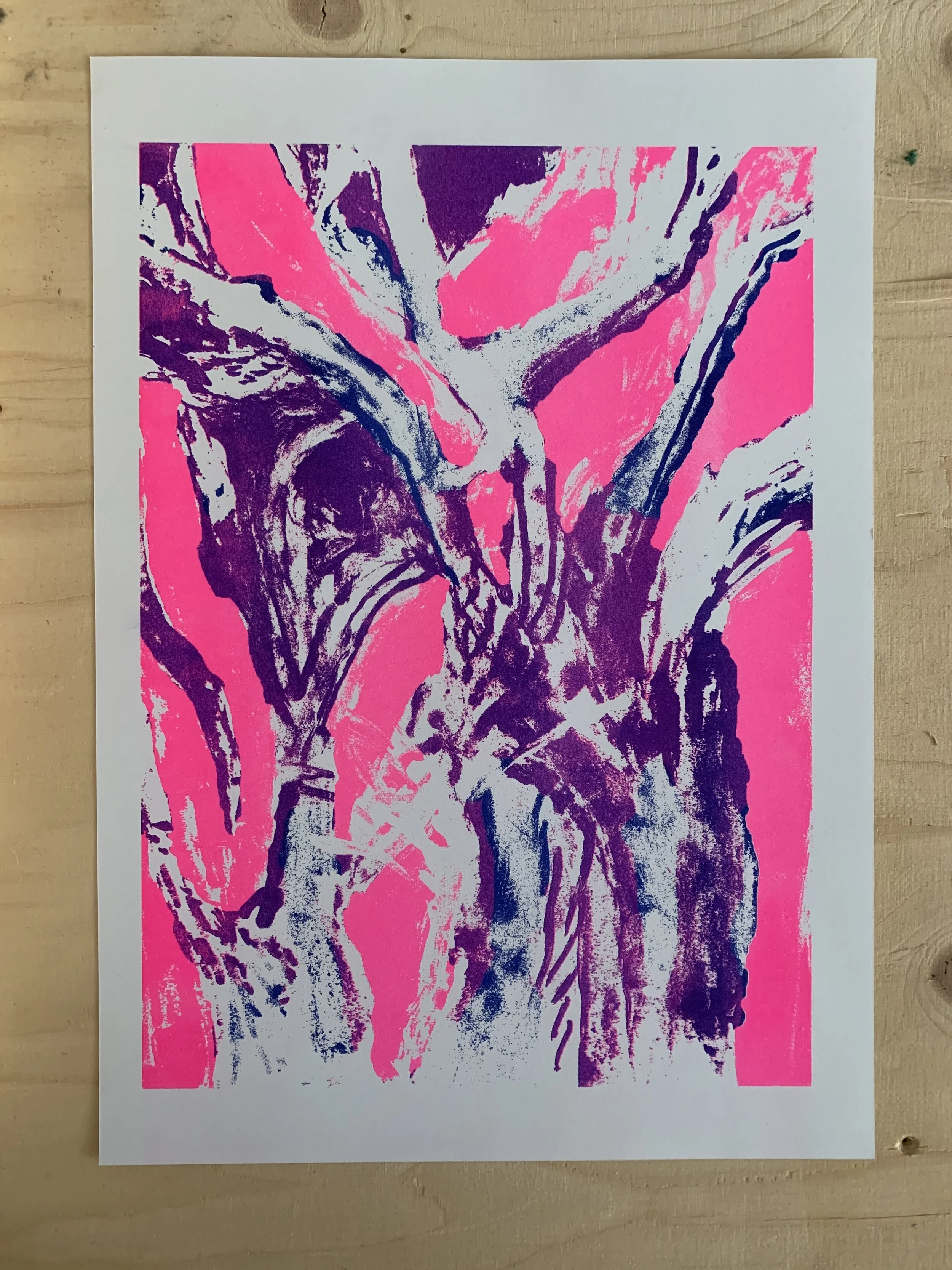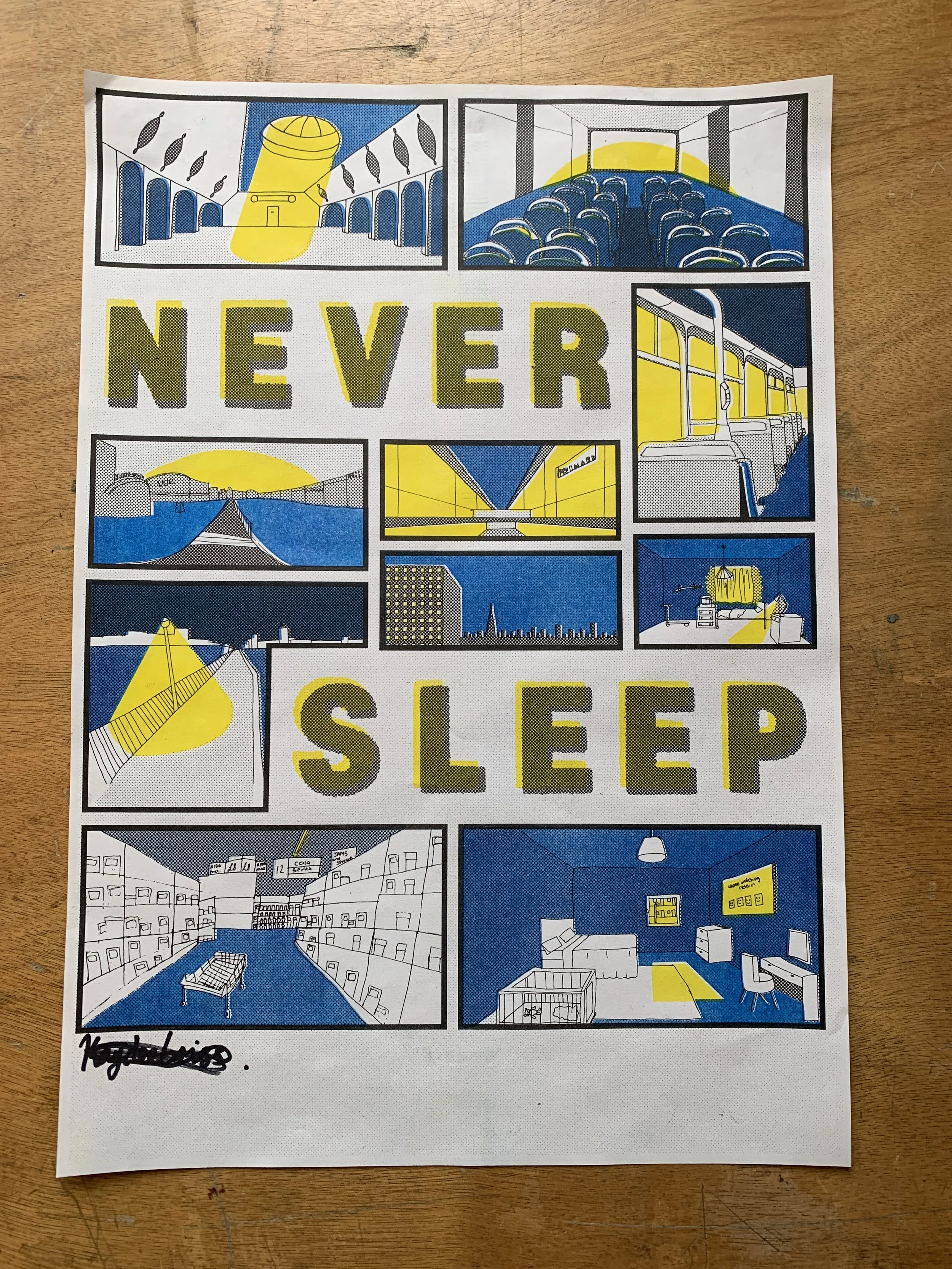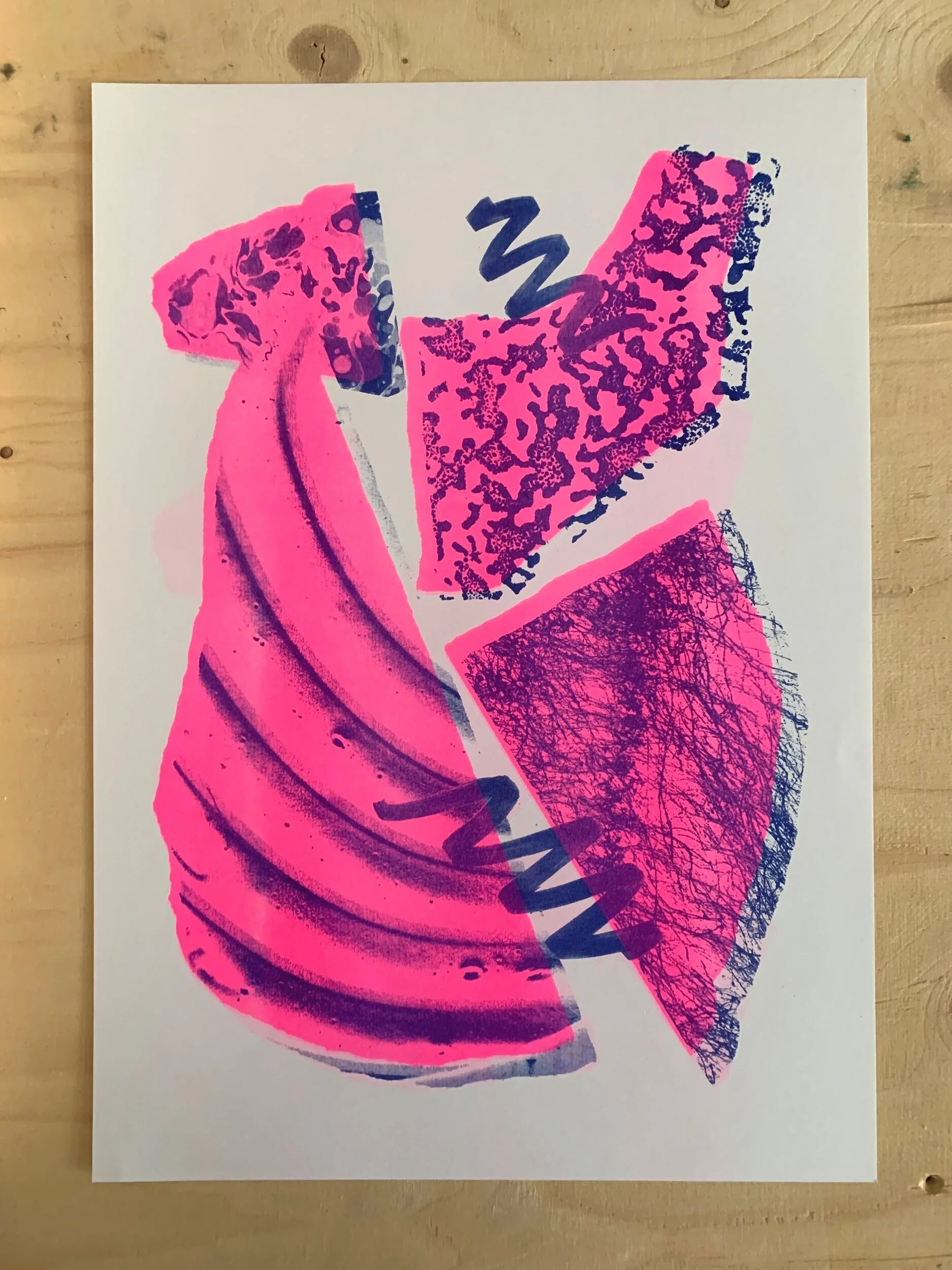 The risograph printing added another layer of challenge and excitement. I chose pink, dark blue and yellow - bold colors that would capture the energy of the places I wanted to represent. What I love about risograph is how unpredictable it can be. The colors overlap in ways you can't completely control, creating happy accidents that often improve the work. With help from riso technician, Sofia, my collages transformed into vibrant prints that seemed to pulse with life.