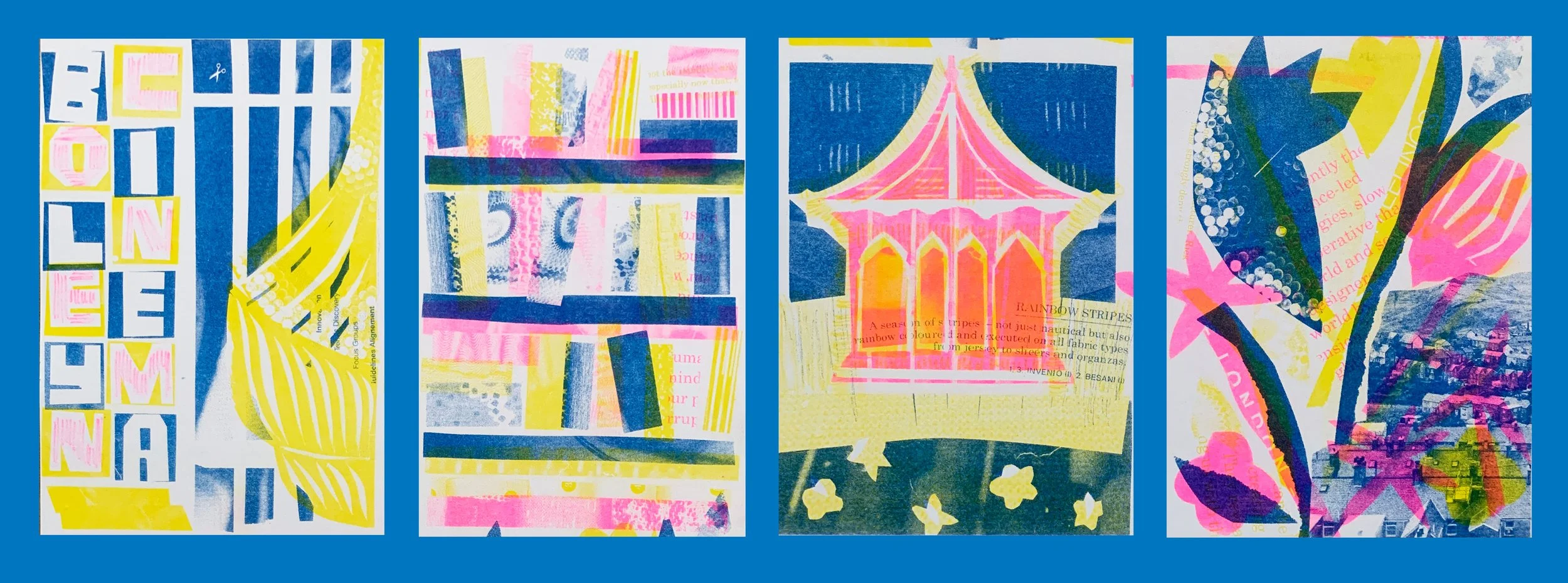 The risograph printing added another layer of challenge and excitement. I chose pink, dark blue and yellow - bold colors that would capture the energy of the places I wanted to represent. What I love about risograph is how unpredictable it can be. The colors overlap in ways you can't completely control, creating happy accidents that often improve the work. With help from riso technician, Sofia, my collages transformed into vibrant prints that seemed to pulse with life.